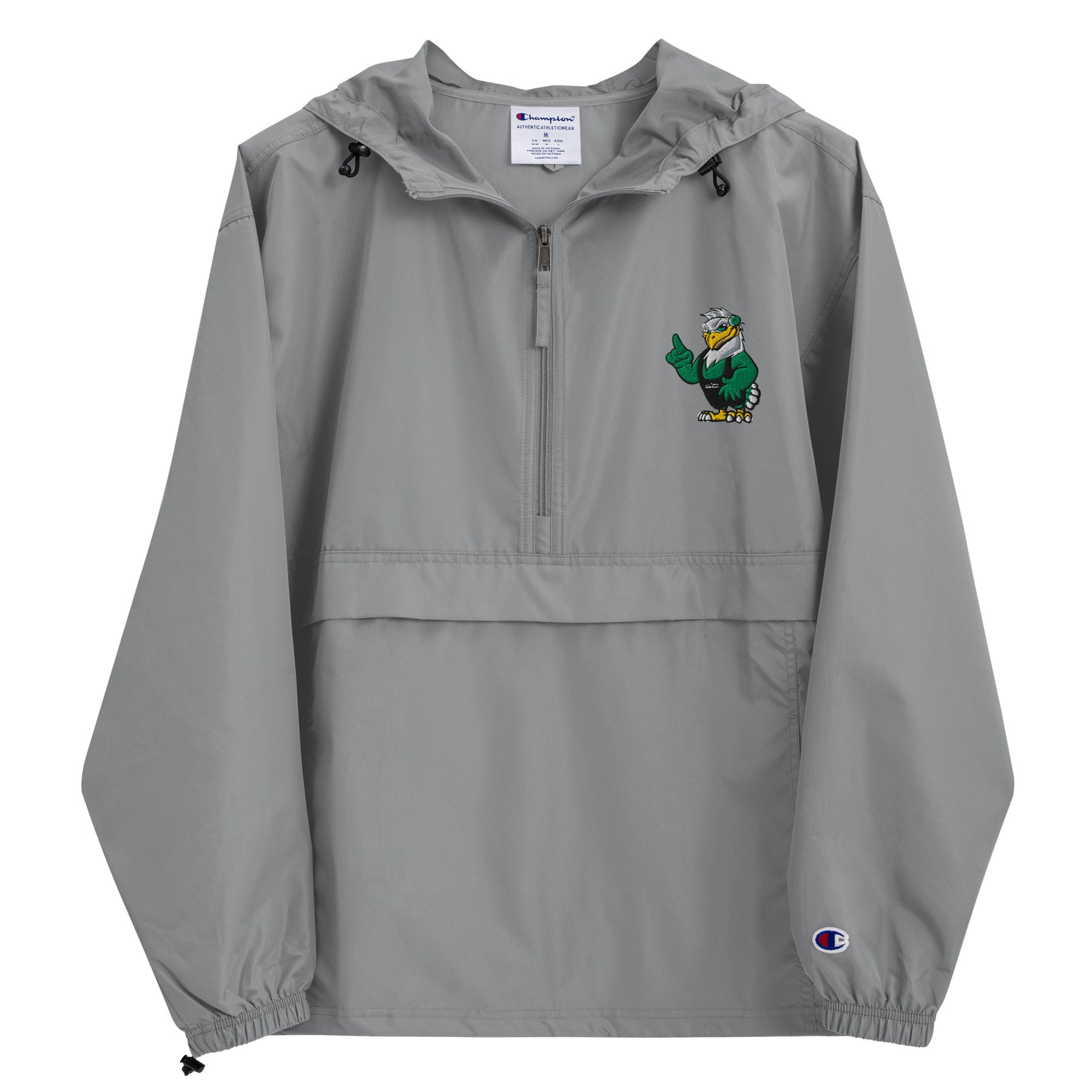 Protect yourself from the elements with this Champion packable jacket. This wind and rain resistant polyester jacket with a detailed embroidery design has a practical hood, front kangaroo pocket, and zipped pouch pocket which you can pull out and use to scrunch the jacket into for convenient storage.